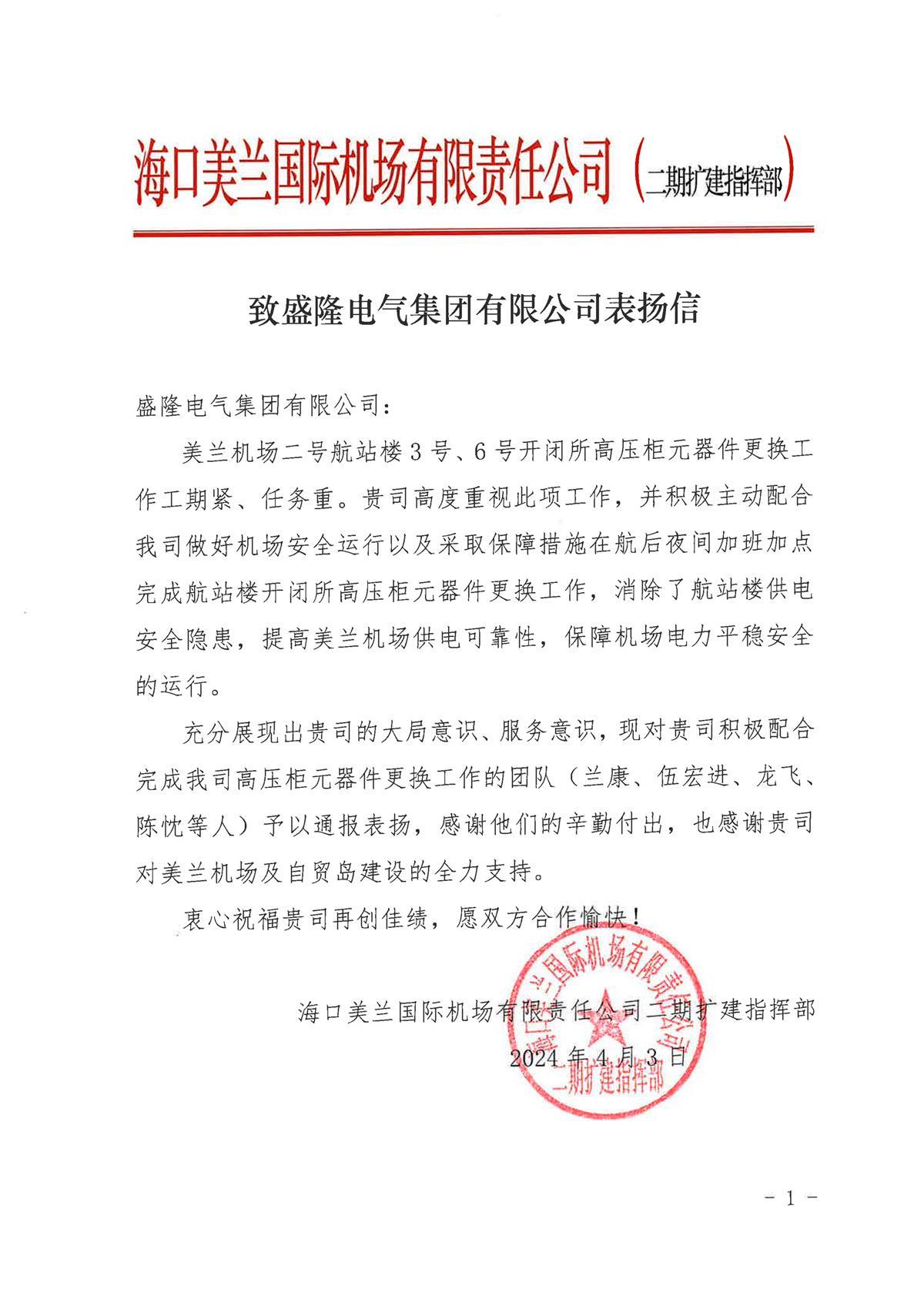 4月初,合作多年的海口美兰国际机场给盛隆电气发来一封表扬信,对在T2航站楼开闭所高压柜元器件更换任务中,加班加点高效完成任务的售后服务团队予以通报表扬和感谢。“作为团队一员,能够为项目方消除航站楼供电安全隐患,保障机场电力平稳安全运行作出贡献,我感到高兴和自豪!”伍宏进激动地对记者说。
