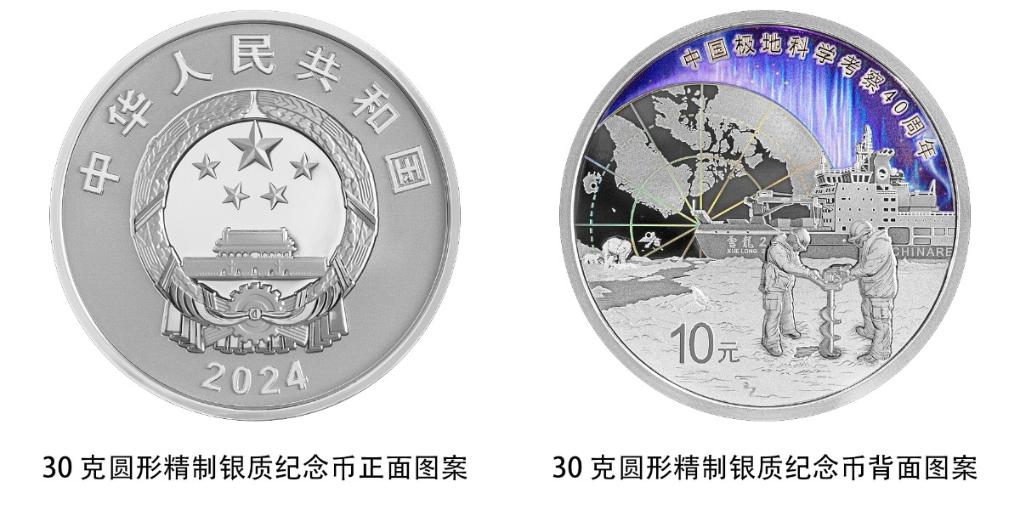 30克圆形银质纪念币背面图案为“雪龙2”号极地考察船、中国极地考察队冰芯取样工作场景、北极熊,辅以局部北极地图轮廓及中国2座北极考察站点位、极光等组合设计,并刊“中国极地科学考察40周年”字样及面额。30克圆形银质纪念币最大发行量50000枚。