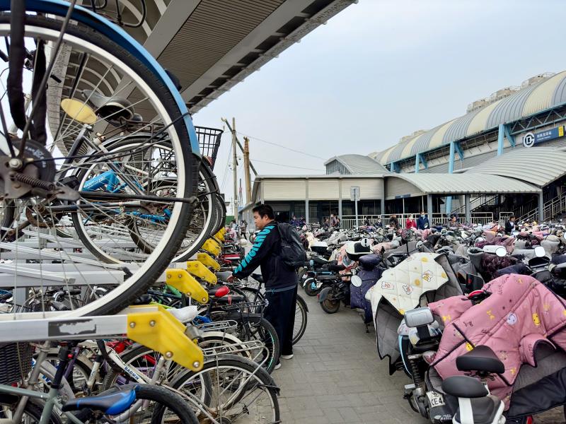 4月2日下午,记者在龙泽站外看到,站前广场上停满了七八排密密麻麻的自行车、电动车,几个立体停车架都在使用当中,有市民正熟练地通过立体停车架存取车辆。