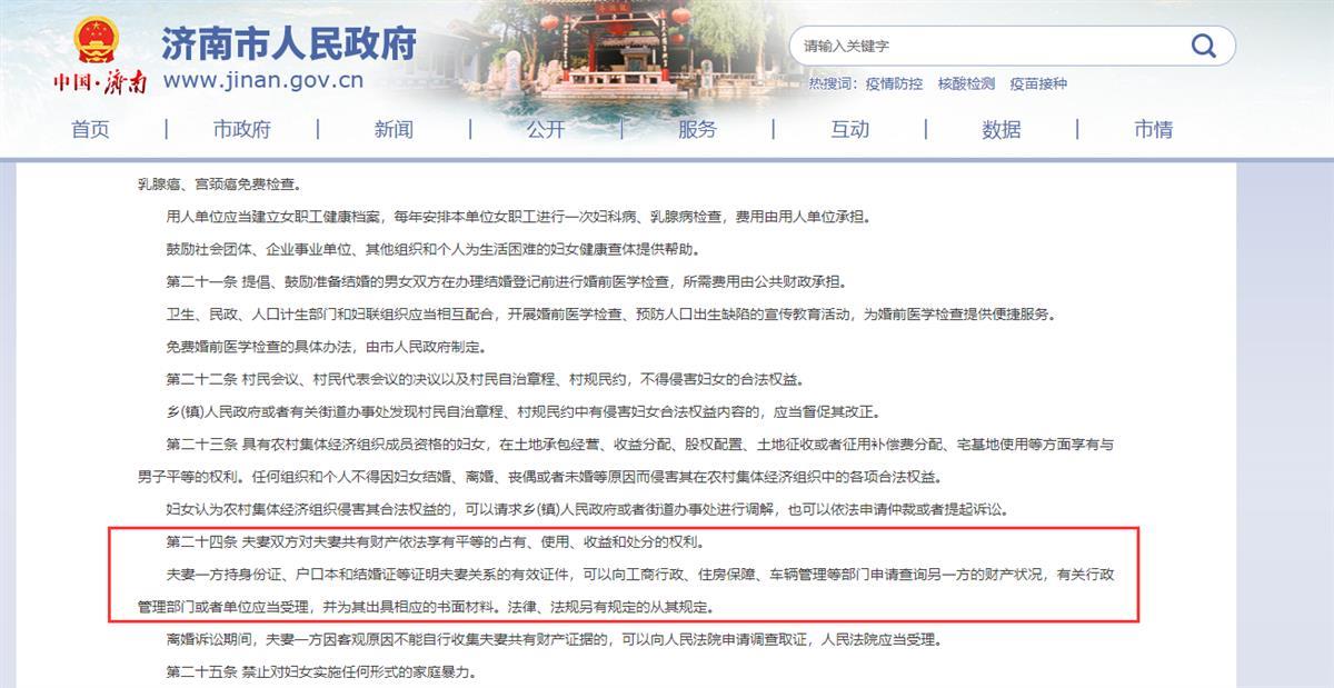 据济南市人民政府官网,2011年1月发布的《济南市妇女权益保障若干规定》第二十四条显示:夫妻一方持身份证、户口本和结婚证等证明夫妻关系的有效证件,可以向工商行政、住房保障、车辆管理等部门申请查询另一方的财产状况,有关行政管理部门或者单位应当受理,并为其出具相应的书面材料。该《规定》写明自2011年5月1日起施行,并未写明有效期。