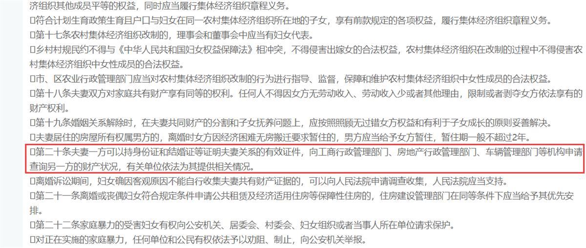 极目新闻记者查询发现,妇女可以查询配偶财产的规定并非福建独有,此前也有一些地方发布了相关规定,允许夫妻一方持有效证件查询另一方配偶的部分财产状况。