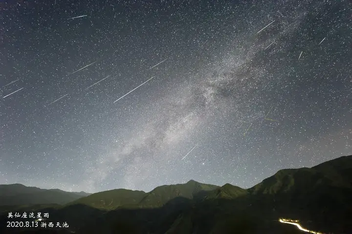他拍过最好的流星照片,是2020年在浙西天池看到的英仙座流星雨。连续拍了两个晚上,挑出其中流星最多的时段,经后期叠加处理后,画面里山体苍劲,乡道蜿蜒,十余颗流星划过璀璨星空。