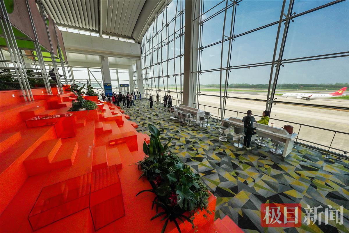 据介绍,6层景观大台阶可同时容纳近100人就坐,玻璃幕墙外的机场跑道上每隔1分钟左右就有一架飞机起降。这里可以免费就座,无需旅客另外消费,有望成为新“网红”打卡点。玻璃幕墙附近的桌椅上配备有充电插座,可以免费充电,为旅客出行提供便利。