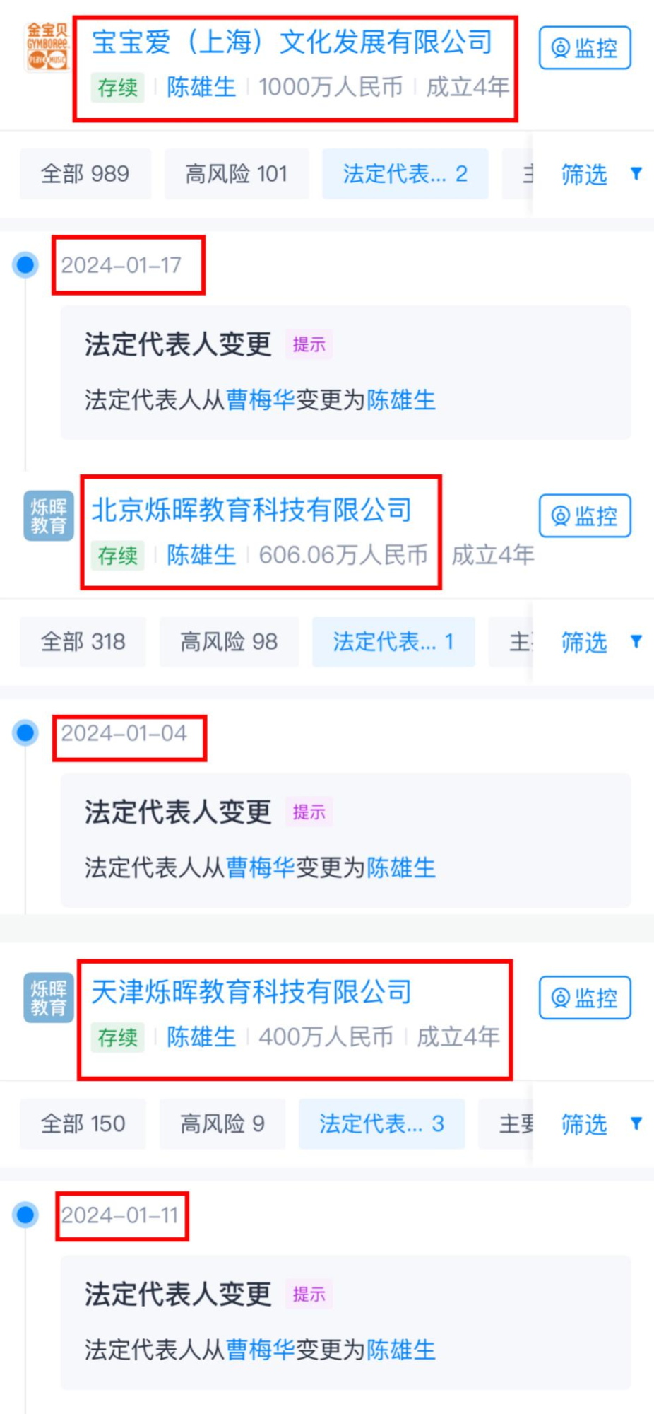 记者查询工商登记信息,发现北京美吉姆一些门店的运营方将法定代表人更换成了辽宁沈阳某村70多岁的老人李震;北京金宝贝、天津金宝贝、上海金宝贝的主体公司都在今年1月陆续变更了法定代表人/记者截图