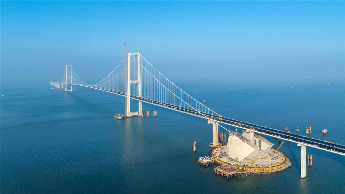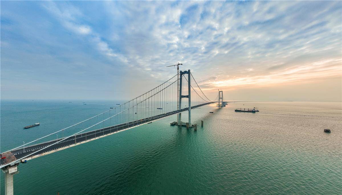 深中通道伶仃洋大桥全长2826米,为主跨1666米的三跨全漂浮体系钢箱梁悬索桥,创下全离岸海中钢箱梁悬索桥跨径最大、通航净高最高、海中锚碇体量最大、主缆钢丝强度最高、颤振检验风速最高等世界纪录,面临世界级技术挑战。中交二航局承建伶仃洋大桥东主塔、东锚碇、上游侧主缆架设和钢箱梁吊装等施工任务。