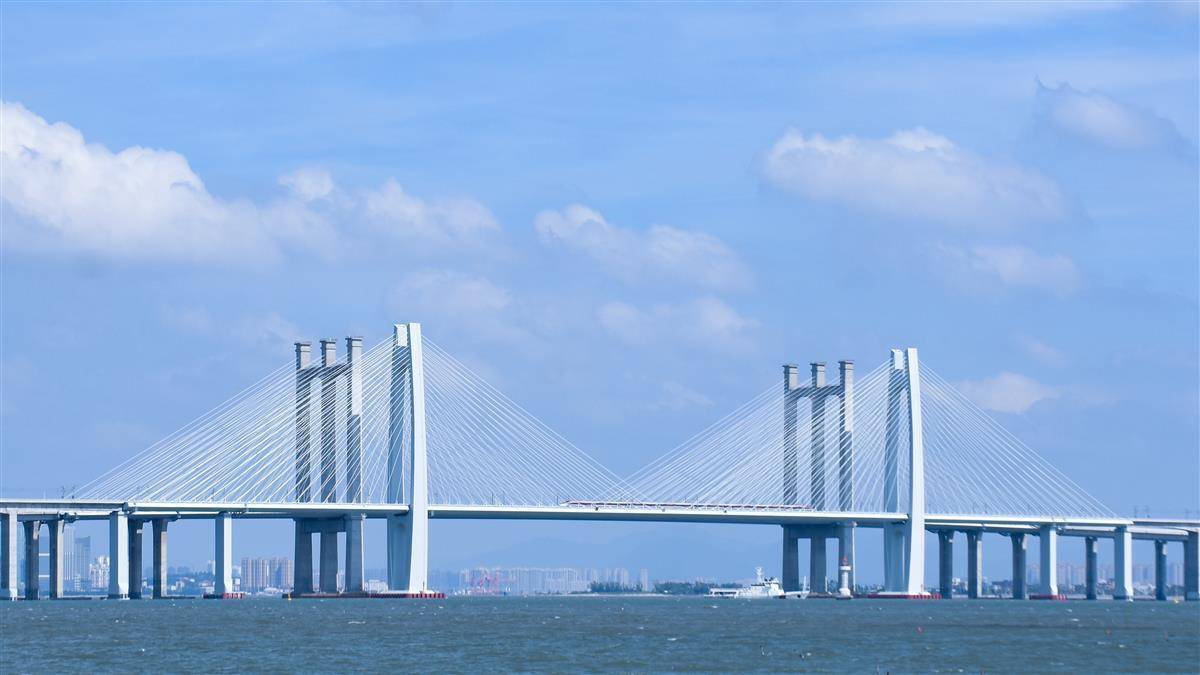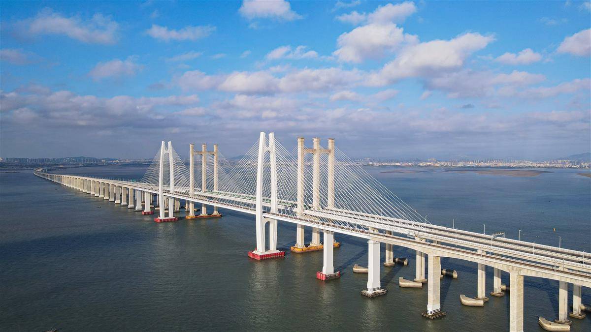 福厦高铁泉州湾跨海大桥位于福建省泉州市,大桥全长20.3公里,海上桥梁长8.96公里,是国内首座跨海高速铁路桥,同时也是世界首座设计、运营时速350公里的跨海高速铁路桥。大桥于2017年9月开工建设,2023年9月建成通车。