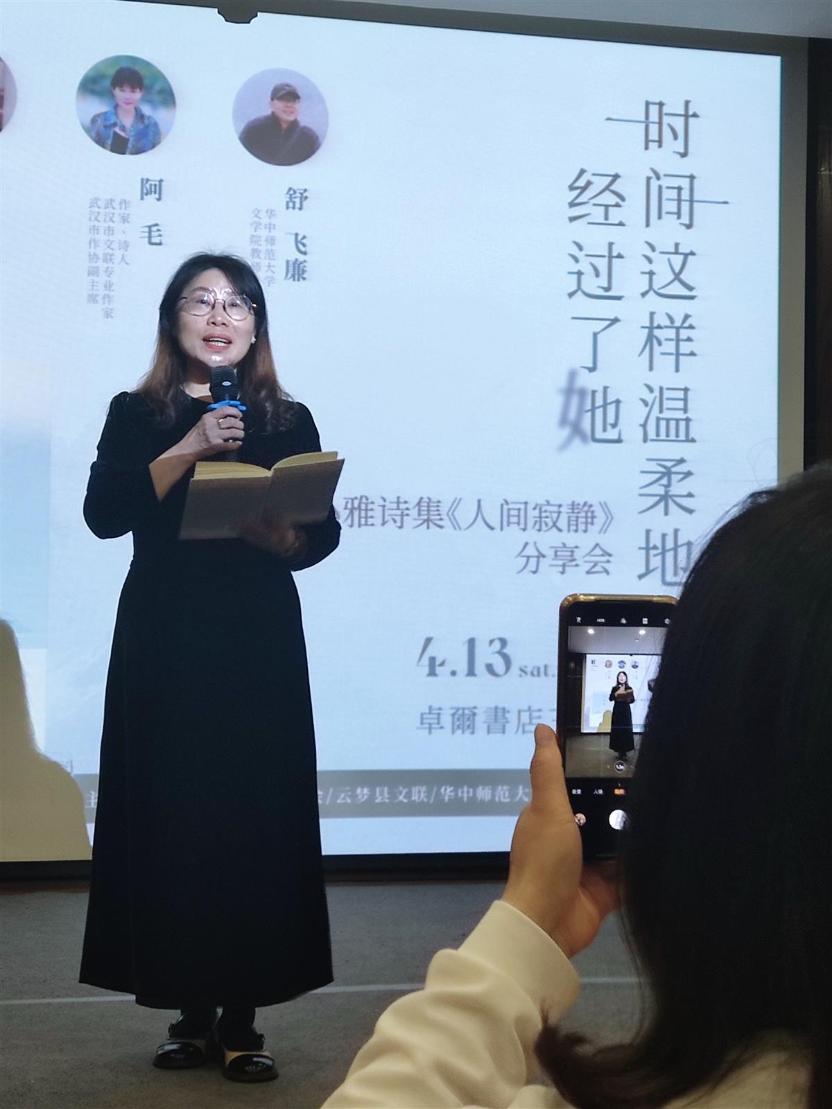 春风轻拂处,花香伴书香。4月13日下午,云梦知名诗人范小雅携诗集《人间寂静》来到汉口卓尔书店。一场以“时间这样温柔地经过了她”为名的分享会,吸引了50多位来自武汉、广州、孝感、云梦、应城、安陆等地的文学爱好者。