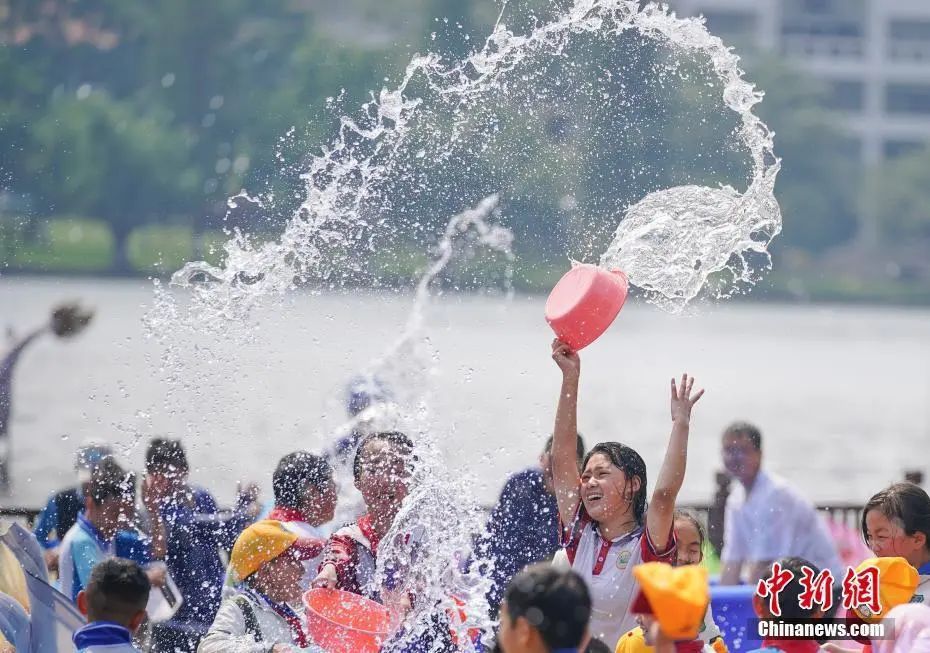 4月12日,傣族女孩和游客泼水。当日,位于昆明市的云南民族村正在举行2024泼水节系列活动,吸引众多市民和游客参与其中。中新社记者 刘冉阳 摄
