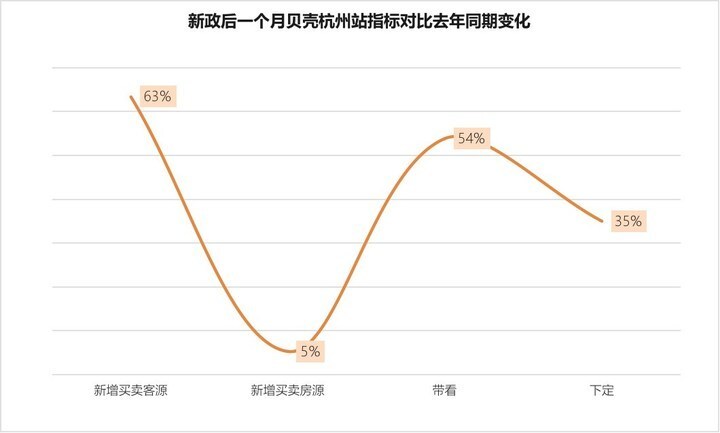 杭州贝壳研究院数据显示,贝壳平台新政后1个月带看量对比去年同期涨幅为54%;新增客源涨幅为63%;下定量涨幅为35%。