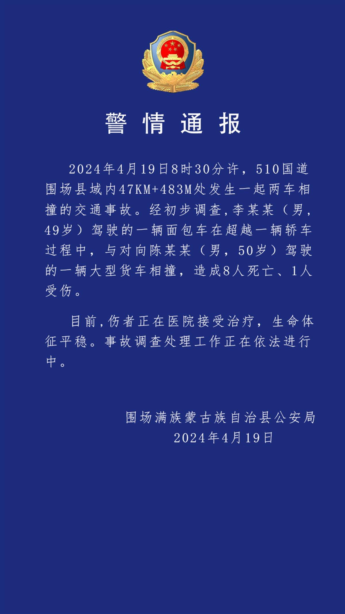 根据通报,4月19日8时30分许,510国道围场满族蒙古族自治县县域内47KM+483M 处发生一起两车相撞的交通事故。经初步调查,李某某(男,49岁)驾驶的一辆面包车在超越一辆轿车过程中,与对向陈某某(男,50岁)驾驶的一辆大型货车相撞,造成8人死亡、1人受伤。目前,伤者正在医院接受治疗,生命体征平稳。事故调查处理工作正在依法进行中。