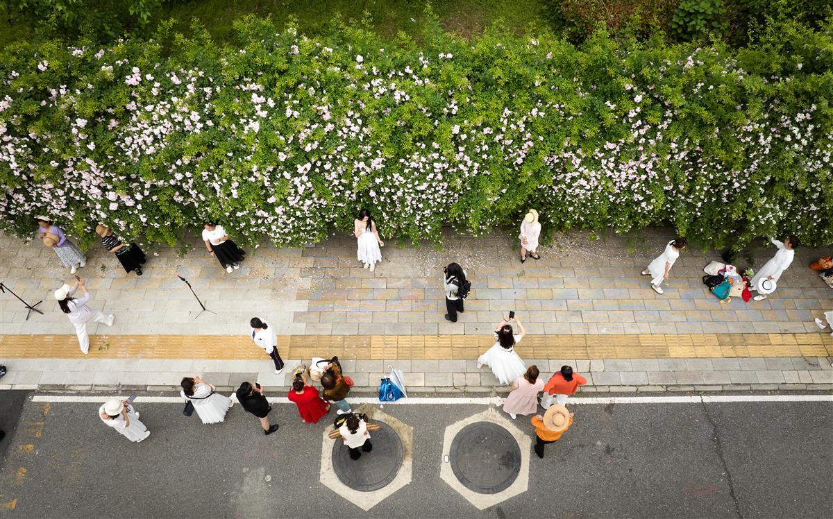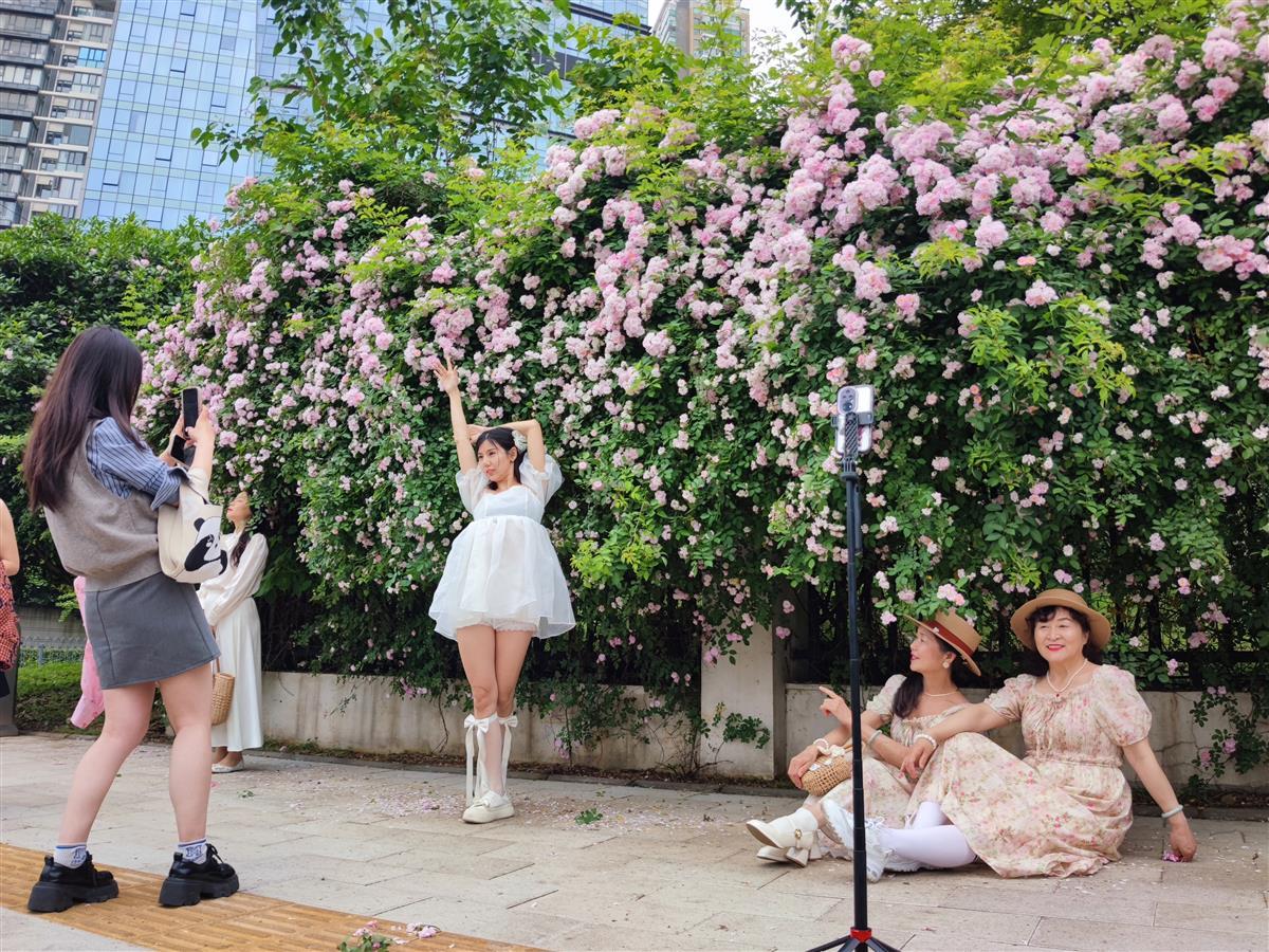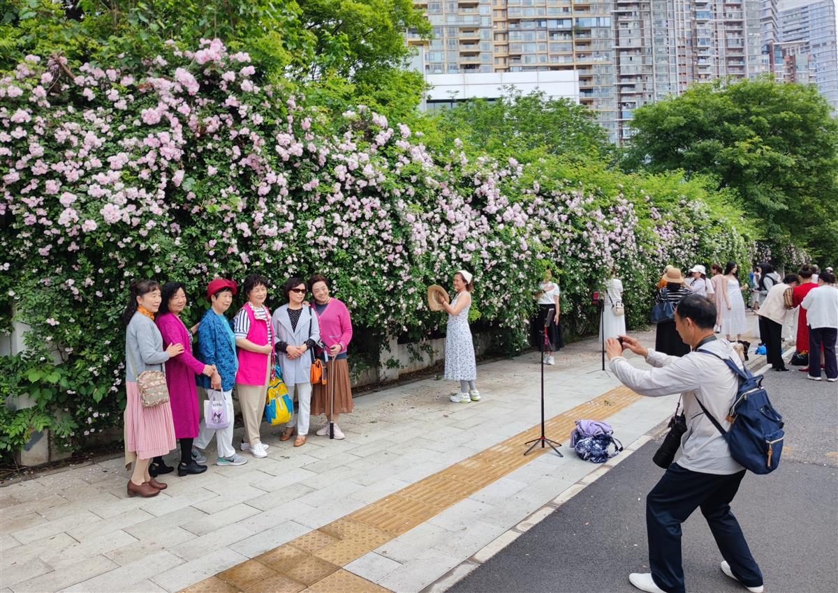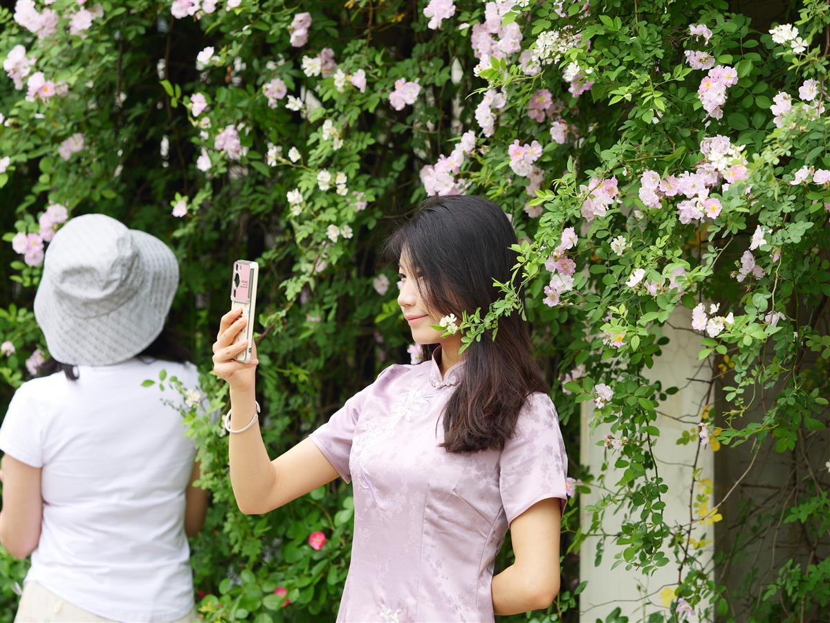 一大早,花墙下便围满了前来拍照打卡的市民游客。人们架起自拍杆、摆出美美的姿势,把满屏的浪漫收入镜头中。