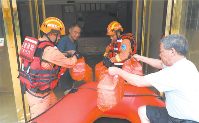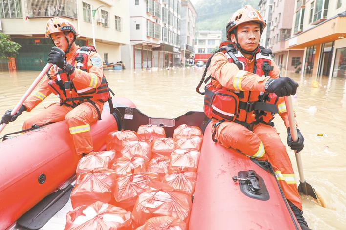消防救援队员划冲锋舟给居民送饭 新华社发
