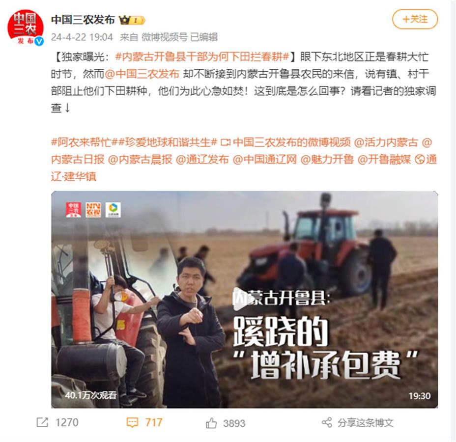 4月22日,据“中国三农发布”报道,内蒙古自治区开鲁县多位种植户反映,有镇、村干部阻止他们下田耕种,种地要交钱,而此前他们已签订了土地承包合同。媒体曝光此事后,当地已成立工作组就此开展调查。23日,当地纪委监委工作人员回应极目新闻记者称,已关注到此事,正在核实涉事村镇干部是否存在违法违纪问题。