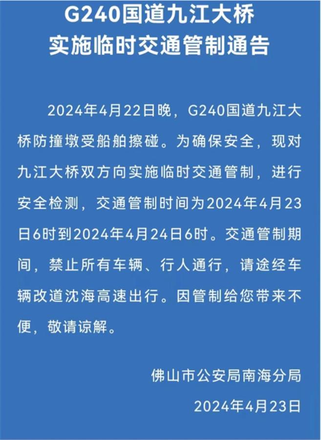 广东省佛山市应急管理局4月23日早通报称,4月22日晚,一艘海船擦碰G240国道九江大桥防撞墩,在担杆洲尾水域抢滩不成功沉没,船上共有11名船员,其中7人获救,另有4人失联,正在搜救,事故原因正在调查中。目前,交警部门已对G240国道九江大桥双方向进行交通管制(时间为4月23日6时到4月24日6时)。海事部门实施通航管制,除应急抢险船艇外,其他船舶禁止驶入G240国道九江大桥上下游三公里水域,过往船只注意绕行。事发后,佛山市全力组织开展救援工作。事故临时指挥部第一时间请专家对G240国道九江大桥进行初步鉴定,主体结构未见明显受损,但桥梁防撞墩有擦痕,需对桥梁安全做进一步鉴定。截至4月23日6时,佛山、江门两地公安及省、市海事部门派出干警、海事救援人员300余人次对失联人员进行搜救。目前,救援行动仍在进行。