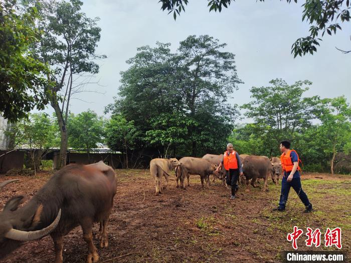 救援人员和曾伯牵引牛群转移到安全地带。清远市清城区 供图