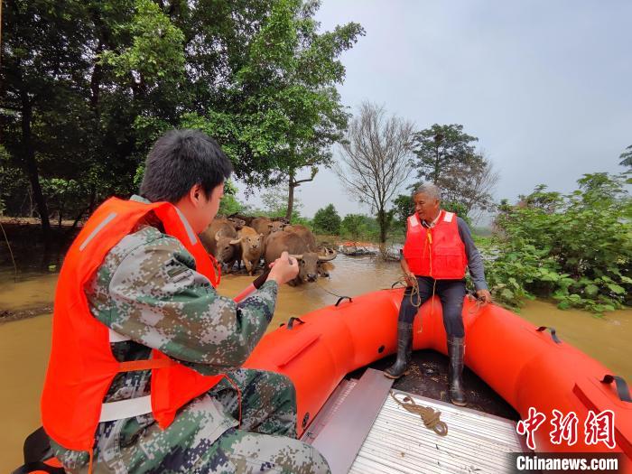 “牛平时进出的道路已被浸没,我还没来得及将牛牵上岸。”曾伯说,想到价值20余万元的牛群,显得十分焦急。考虑到时间紧急,救援队带上曾伯迅速穿上救生衣走上皮艇,到达“小岛”后,队员把捆住牛的绳子解开,由曾伯牵引并喊着放牛的“口号”安抚牛的情绪,然后救援队员将捆住牛的绳子绑定在皮艇上,通过救援队员划动皮艇牵引牛群游上岸。