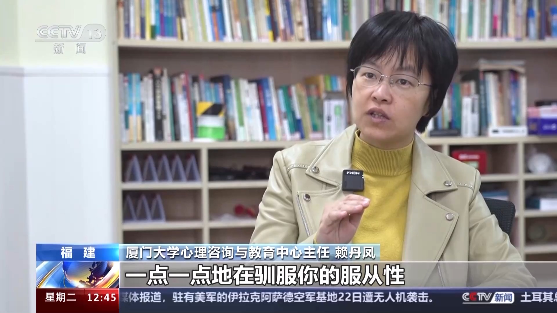 厦门大学心理咨询与教育中心主任 赖丹凤:精神控制的这一个团体作案,他们经常会有很多仪式化的部分,就是用这套仪式化的部分,一点一点地在驯服你的服从性。刚开始进入这个团队的时候,也许你就会觉得,这些人为什么都跪拜,为什么都喊叫,那时候你还能站在岸上。但凡你开始第一个服从性的动作,那个服从性都很简单,他说你只要待在这看我们就行。你做第一个服从性的动作,没有掉头就走,你就会有第二个服从性的动作,你就会开始有第三个。这种服从性的动作越来越多以后,忽然间回头发现,我怎么也开始说这么经不起推敲的话,做这么丢脸的事情,或者表现得这么情绪化。其中既有暗示的作用,也有环境的这种群体压力,还有就是我们开始一步一步被催眠的过程。