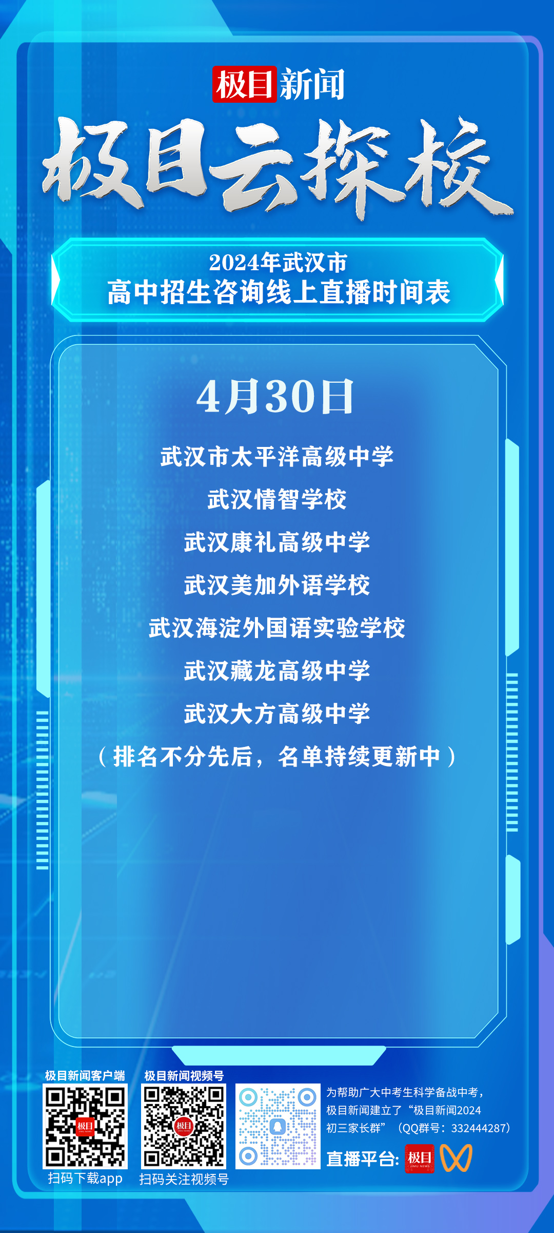 为了让初三学生和家长更全面地了解中考政策,为家长提供近距离与学校交流的平台,楚天都市报极目新闻推出“极目云探校2024年武汉高中学校招生咨询线上直播”,邀请一批高中学校招生负责人走进5G演播厅,介绍各自学校特色和招生政策。