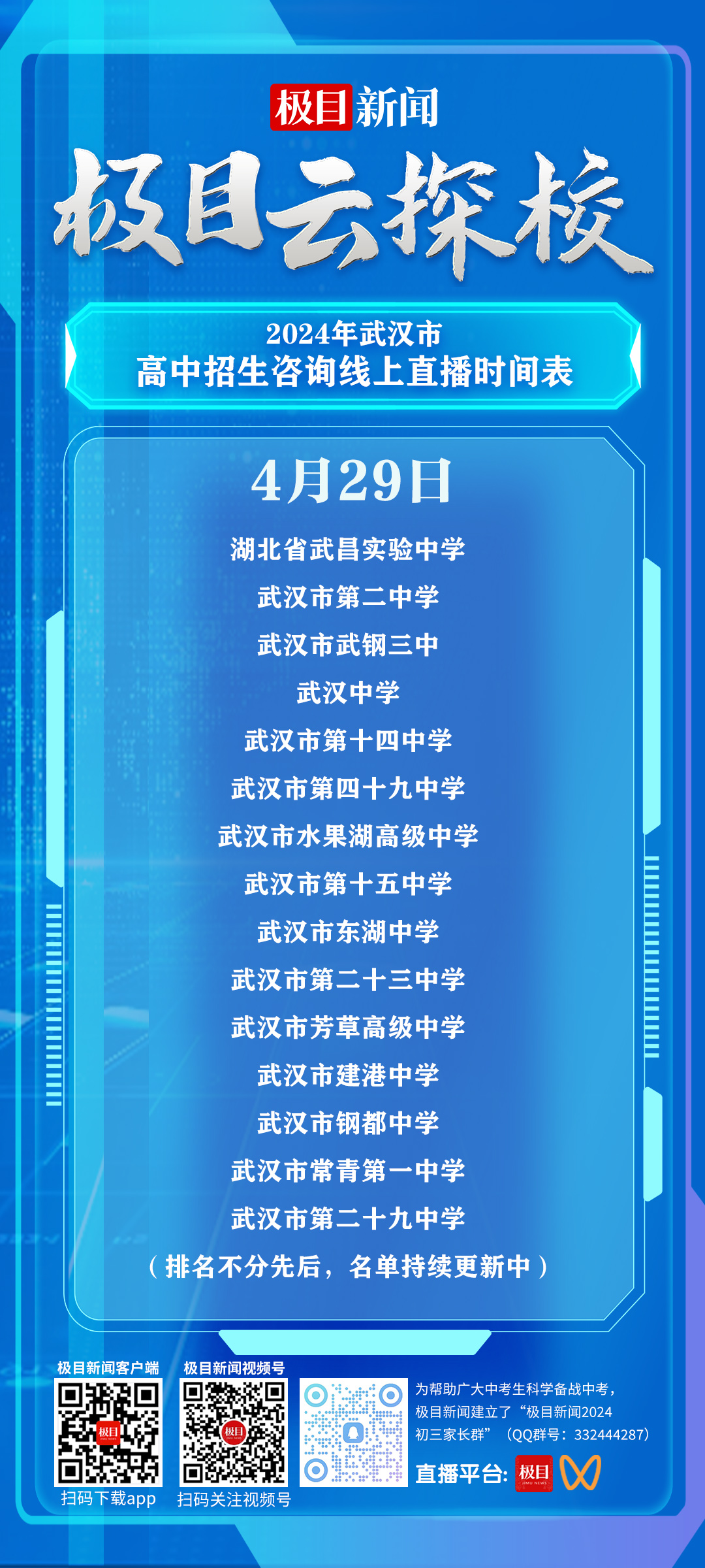 为了让初三学生和家长更全面地了解中考政策,为家长提供近距离与学校交流的平台,楚天都市报极目新闻推出“极目云探校2024年武汉高中学校招生咨询线上直播”,邀请一批高中学校招生负责人走进5G演播厅,介绍各自学校特色和招生政策。