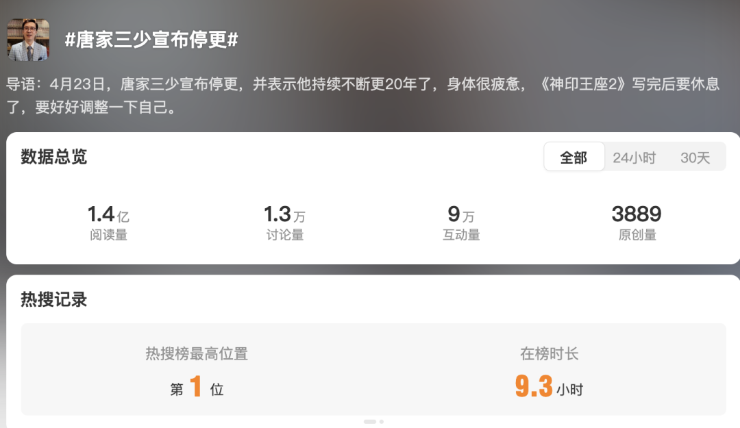 4月24日晚,相关话题冲上热搜第一。据悉,此前“唐家三少”唯一一次的断更,是因为老婆木子的离世。