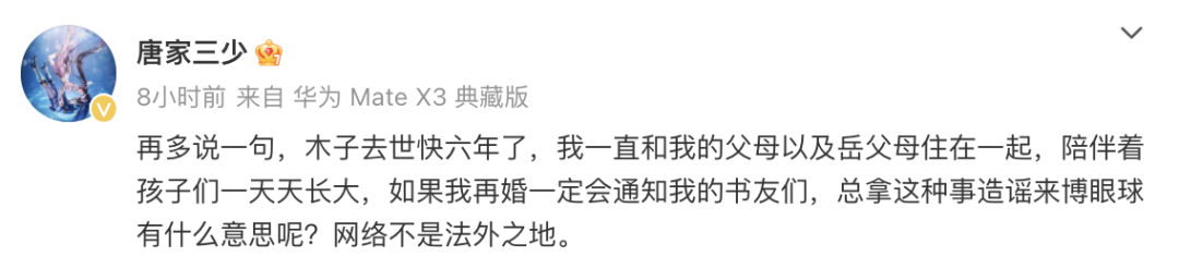对于网友称其“立爱妻人设又转头再婚”传闻,唐家三少称:木子去世快六年了,我一直和我的父母以及岳父母住在一起,陪伴着孩子们一天天长大,如果我再婚一定会通知我的书友们,总拿这种事造谣来博眼球有什么意思呢?网络不是法外之地。