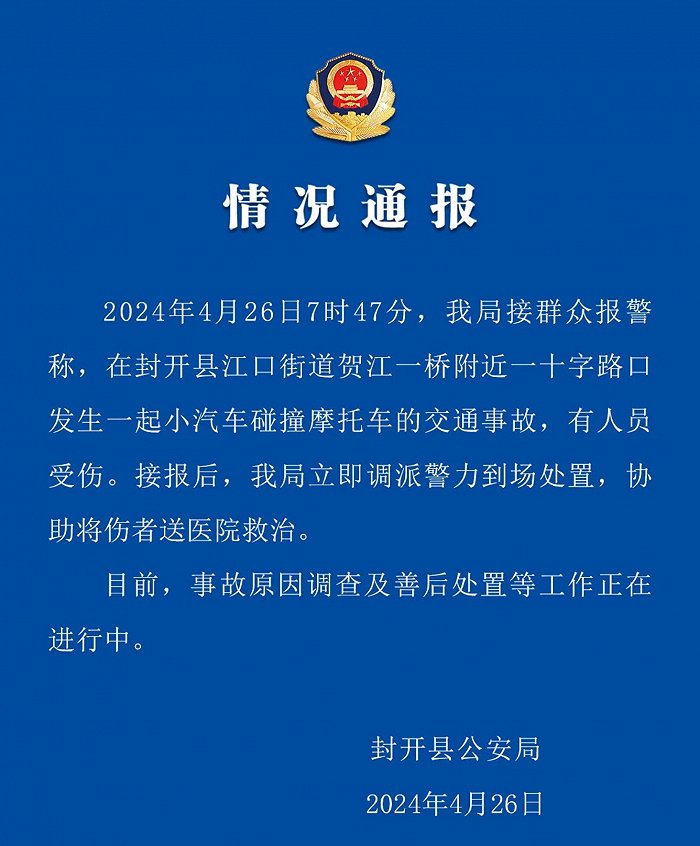 广东省肇庆市封开县公安局发布情况通报:4月26日7时47分,我局接群众报警称,在封开县江口街道贺江一桥附近一十字路口发生一起小汽车碰撞摩托车的交通事故,有人员受伤。接报后,我局立即调派警力到场处置,协助将伤者送医院救治。目前,事故原因调查及善后处置等工作正在进行中。