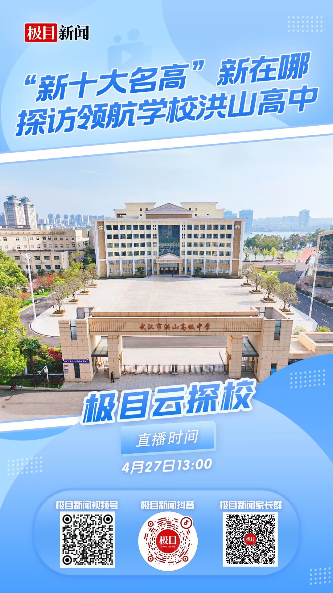 你的梦想高中是什么模样?4月27日13:00,请跟随极目新闻记者的镜头,一同探访武汉市洪山高级中学。本期“极目云探校”节目,将通过极目新闻微信视频号、官方抖音同步直播。