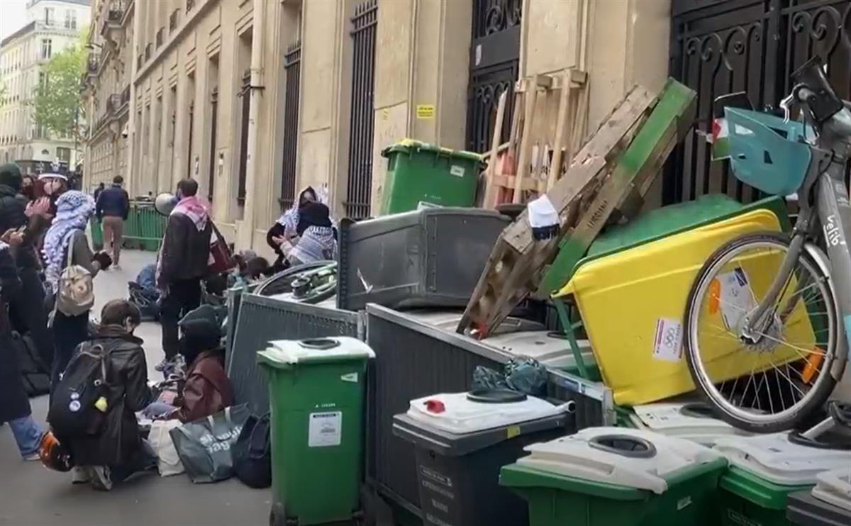 26日,数十名学生在巴黎政治学院位于巴黎市中心的一个校区用垃圾桶、自行车等挡住了一栋楼的入口。抗议的学生中,有人高喊支持巴勒斯坦的口号,还有人呼吁抵制以色列高校、停止在加沙地带实施种族灭绝。
