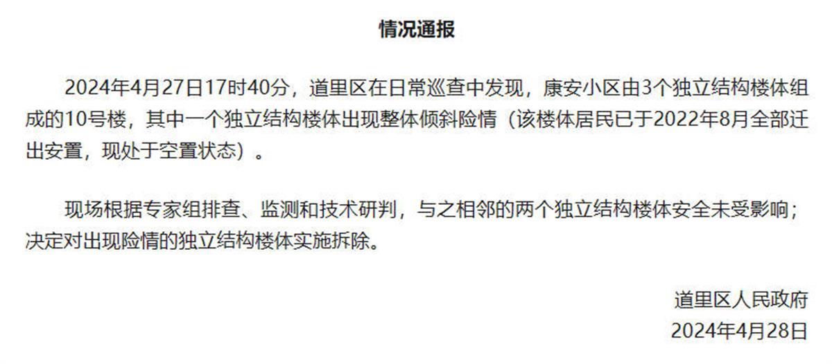 4月27日,黑龙江哈尔滨道里区康安小区一楼体出现开裂、倾斜。4月28日,一张“警情通报”在网上流传,其称墙体开裂是因居民在家里聚餐,超过安全荷载所致。当日下午,哈尔滨警方回应极目新闻(报料邮箱:jimu1701@163.com)记者称,未发过上述通报,网上流传的通报是假的。