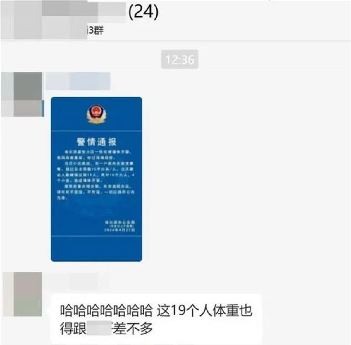 一张落款为哈尔滨市公安局的“警情通报”称,哈尔滨康安小区一住宅楼墙体开裂,经现场排查,当日小区高层有一户居民在家里聚餐,超过安全荷载15平方米/人。当天聚会人数峰值达19人,其中15个大人、4个小孩,造成墙体开裂。该“警情通报”还提到,建筑质量合理合规,所有流程合法,请市民不造谣、不传谣,一切以政府公告为准。