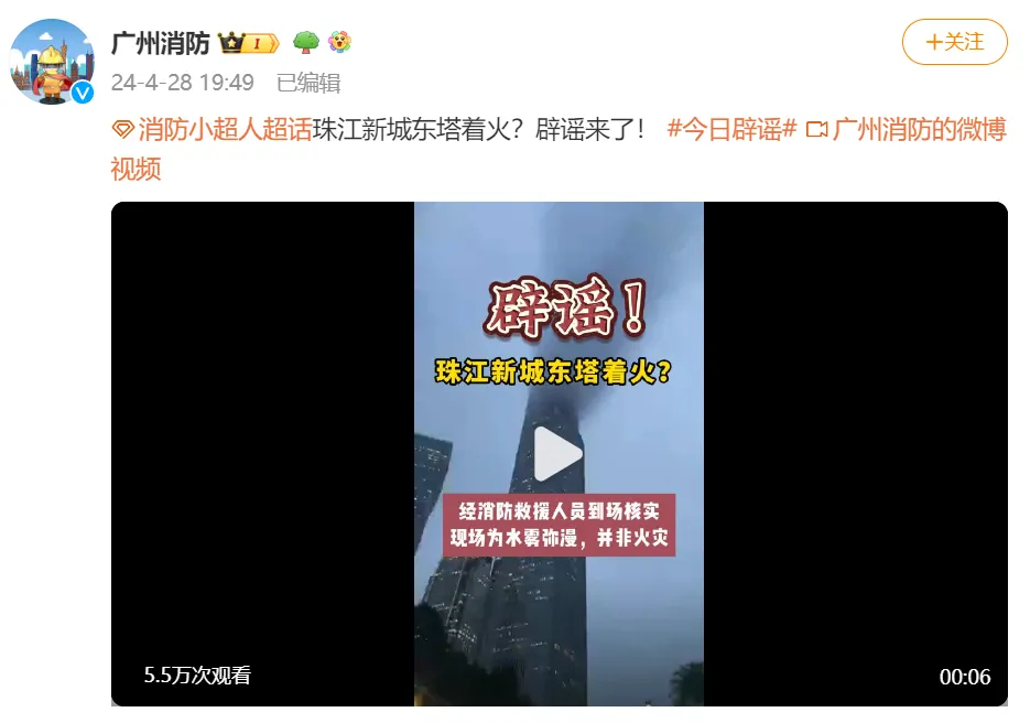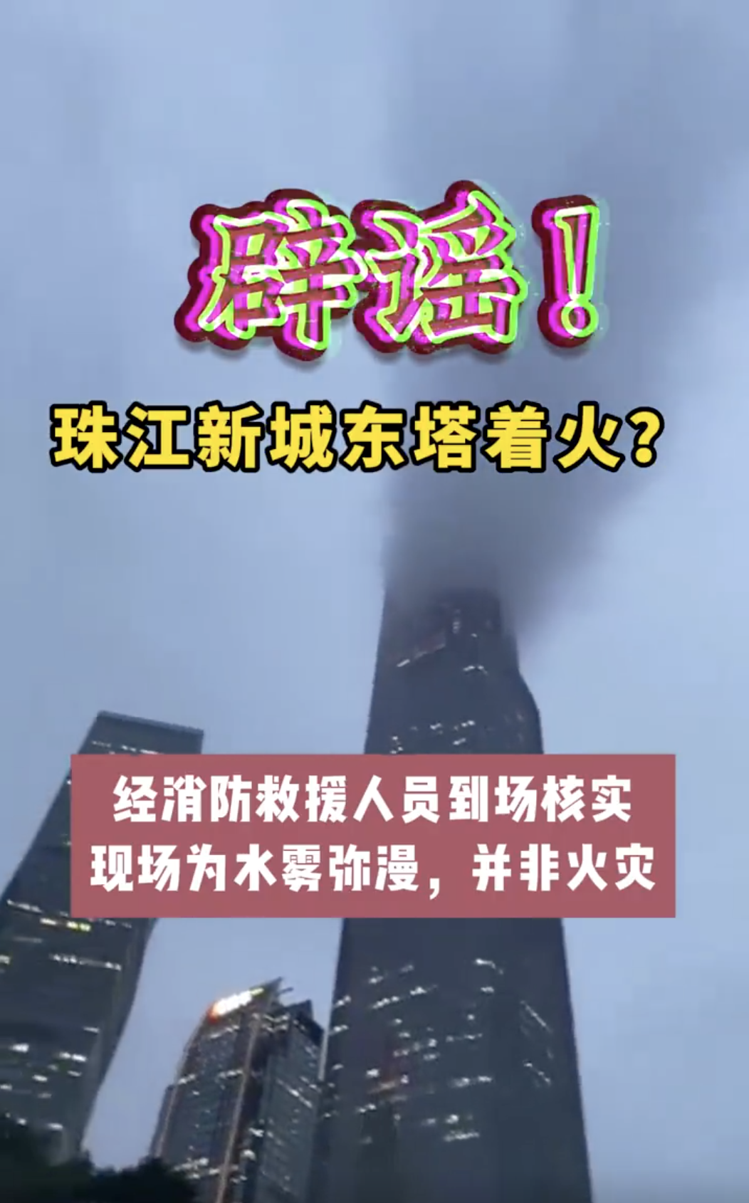 4月28日早些时候,有网友在社交平台发布信息称,珠江新城东塔疑似有烟冒出,“路过还听到消防车的声音”。后@广州消防 发布微博辟谣,请大家不信谣不传谣。