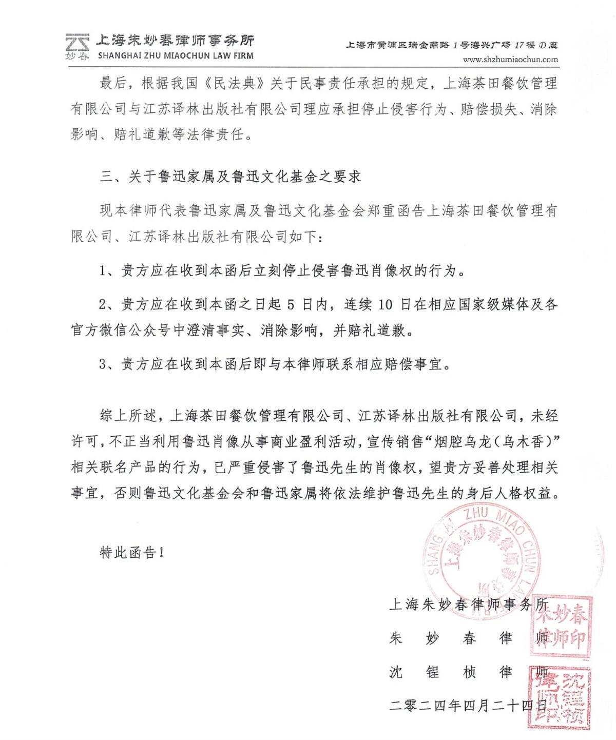 委托律师认为,上海茶田餐饮管理有限公司与江苏译林出版社有限公司,未经许可,擅自以盈利为目的,利用鲁迅肖像宣传销售“烟腔乌龙(乌木香)”相关联名产品的行为,已严重侵害了鲁迅先生的肖像权,理应承担相应法律责任。希望两家公司在收到本函后立刻停止侵害鲁迅肖像权的行为,并在收到本函之日起5日内,连续10日在相应国家级媒体及各官方微信公众号中澄清事实、消除影响,并赔礼道歉。还需与律师联系相应赔偿事宜。