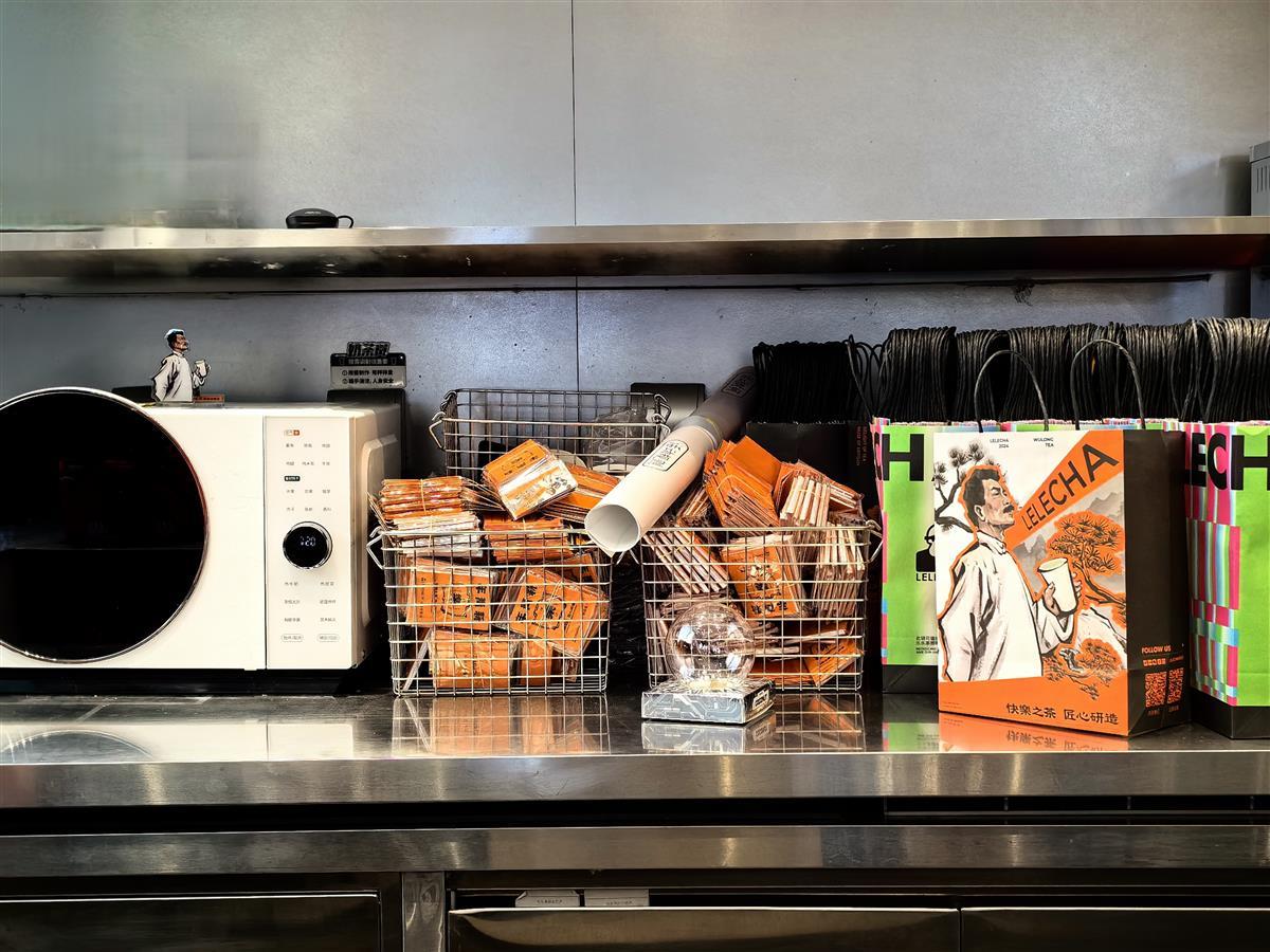 4月29日下午,极目新闻记者来到上海市普陀区一家乐乐茶门店,看到门店内外没有此次联名的宣传物料,但正对门的打包台上,有一个已打开的带有鲁迅形象的打包纸袋。纸袋上,鲁迅形象的人物手拿一杯茶饮,眺望远方,身旁带有乐乐茶的标识。