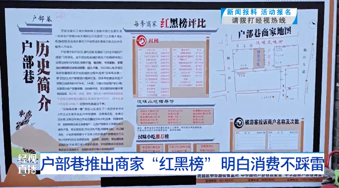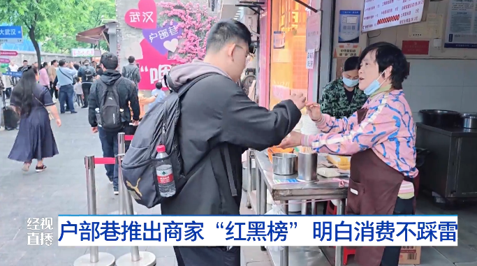武汉市户部巷管委会负责人桂杰介绍:“五一假期方便游客到户部巷游玩,户部巷管委会和户部巷商会为了规范辖区的景区经营,推出了这个‘红黑榜’,把优质商户公布出来,同时遭到游客投诉的商户会进入黑榜,还有针对户部巷街区小吃的指导价格,避免商户假期随意抬高价格。”