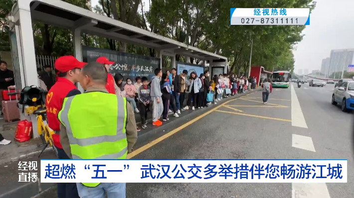面对客流高峰,武汉公交科学组织运力,多举措方便市民、游客舒心畅游。五一假期首日,全国各地游客蜂拥来汉,出行需求激增,在武汉市民之家公交站点,候车的乘客排起了四五百米的长队,但在工作人员和志愿者的引导下,大家是有序等侯,沿线的公交也是满运力投放,迅速疏散乘客。