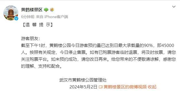 通知称,截止到2024年5月1日23时,鹿院坪景区通过网络及旅行社团队预订人数已达景区单日最大承载量,为确保广大游客的游玩安全和游览品质,停止线上购票和渠道预订,请已预订和购票的游客错峰入园,尚未购票的游客提前通过网络预订5月3日的门票。