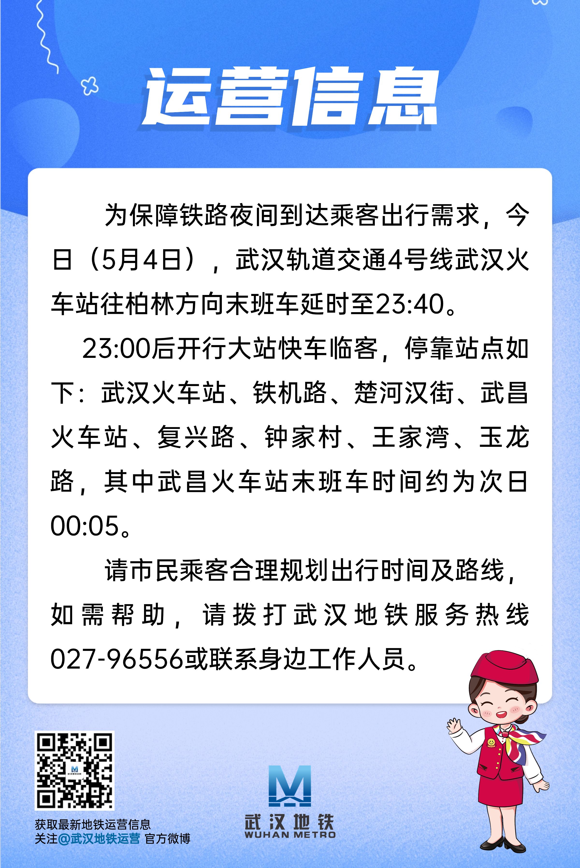 为保障铁路夜间到达乘客出行需求,今日(5月4日),武汉轨道交通4号线武汉火车站往柏林方向末班车延时至23:40。