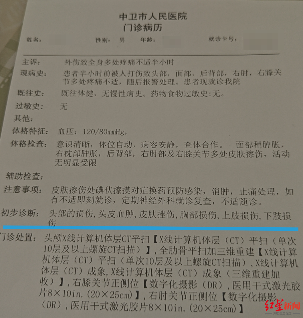 在刘某提供的多张证据里,红星新闻记者看到,中卫市人民医院在5日凌晨出具了初步诊断结果,即(刘某)头部的损伤,头皮血肿,皮肤挫伤,胸部损伤,上肢损伤,下肢损伤。此外,中卫市公安局滨河派出所也出具了一份受案回执,表明该案已被受理。