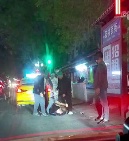 网传视频显示,在“鼓楼西街”的牌子边,一辆黄色的出租车尾部有一倒地男子遭到另外两名男子殴打,期间被对方多次用脚踹。同时,还有一男一女试图拉架。