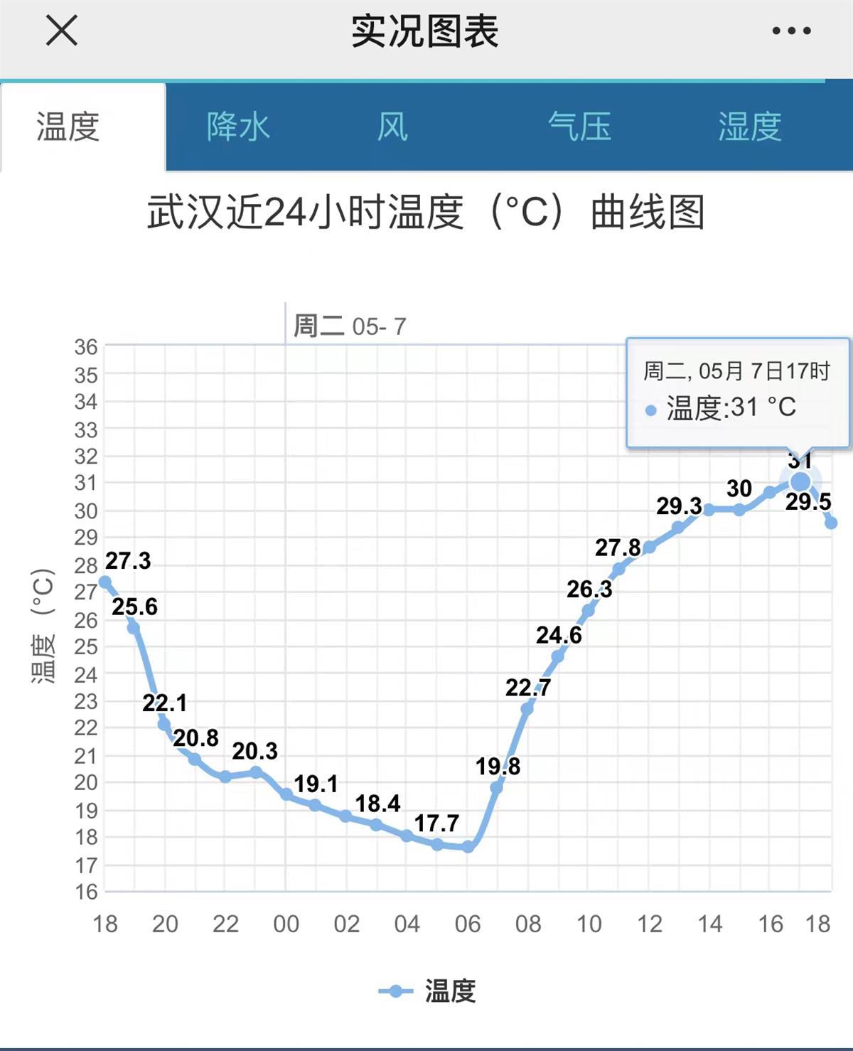 近两天,阳光在线,气温上升,今日(7日)下午3时,湖北大部地区气温已跃过30℃,最高为恩施建始32.8℃;武汉今日最高温为17时的31℃。