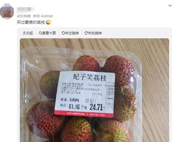 相比往年同期,今年荔枝的价格确实要高一些,让人有些“望而却步”。在社交媒体上,有网友发布的图片显示,买十颗妃子笑荔枝花了15元。