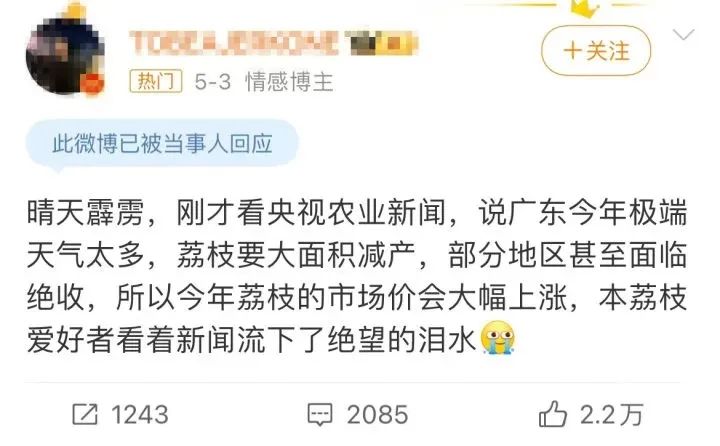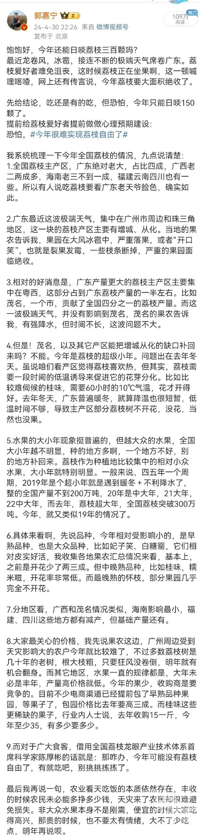 对此央视三农主持人郭嘉宁近日在微博上做出了回应,分九点系统梳理了今年全国荔枝的情况,结论是:吃还是有的吃,但恐怕,今年只能日啖150颗了。给荔枝爱好者提前做做心理预期建设:恐怕,今年很难实现荔枝自由了。