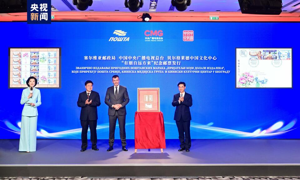 活动当天还发布了以“有朋自远方来”为主题的纪念邮票。该纪念邮票由中央广播电视总台和塞尔维亚邮政局、贝尔格莱德文化中心共同设计、联合发布。三枚邮票分别为《河姆渡与温查文化——历史深处的对话》《文化中心——中塞文化交流的舞台》《匈塞铁路——“一带一路”合作的典范》,票面图案设计浓缩了中塞文明互鉴、文化交流和互利合作的精彩瞬间。