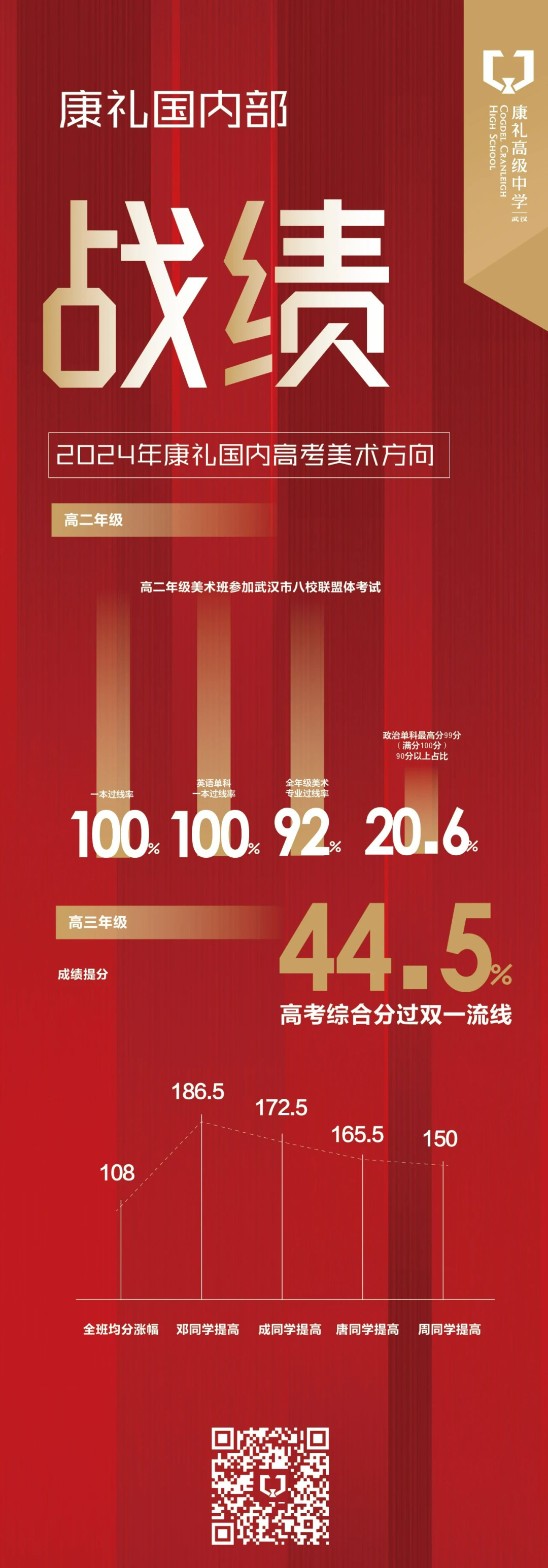 据了解,该校美术部首年毕业生综合分700分以上达10%,最高分711分,位列全省171名,综合分600分以上占比45%,康礼美术高考学子综合分进入全省1%行列。