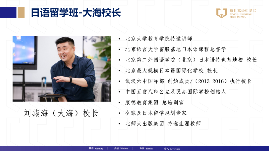 “日本教育一直是世界各国教育当中位居前五的教育水平,日本在精工、电子、电气、环保、教育、养老、康养、医疗、全球物流、经济学、汽车工业等各方面的教育教学水平和生产力水平都保持着世界最前端的地位,中国学生报考日本大学,可以参加3-4次日本的留学生考试,有2-4次面试机会,在3-4次留学生考试中,根据日本的大学入学申请要求,取最好成绩去申请日本的大学。”日本留学项目总督学刘燕海校长介绍,康礼现在已经正式成为北京语言大学北语留服日本语基地校。今年,该校日本班将会开设日本文科班、理科班、艺术班。