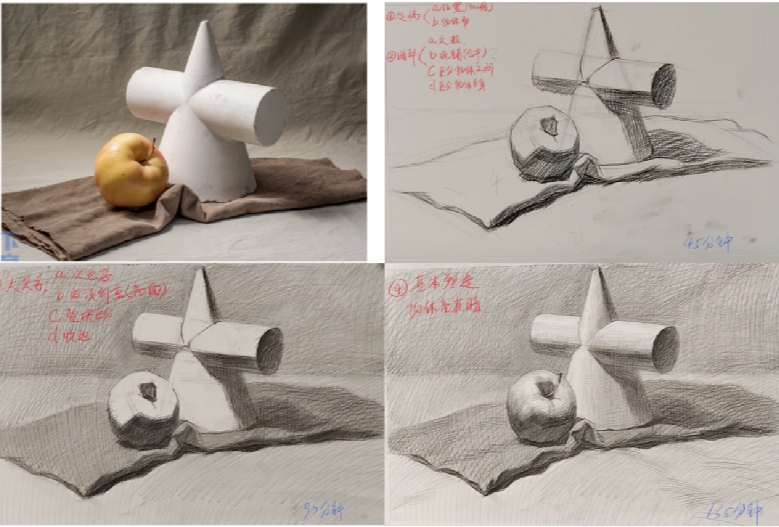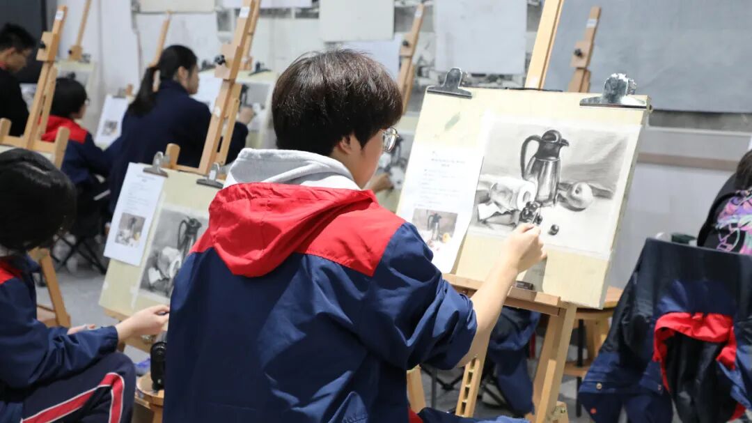 在康礼美术部,还有一个不成文的规定——每天中午12:30—14:00,专业老师们都会准时走进画室对同学们进行指导,有时候老师们还会和同学们一起画,为大家做示范。“中午的画室很安静,除了铅笔在纸面上摩挲发出的‘沙沙声’外,再无其他,每个人都沉浸在自己的画纸里。”张鹤龄说,虽然每天中午只有短短1.5小时,但老师的点拨,总能让她醍醐灌顶。“只要日复一日地坚持,一个学期就有211.5小时,量变一定可以产生质变。”