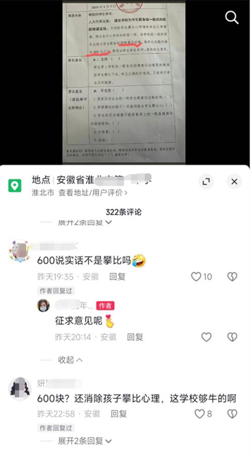 “尊敬的学生家长:人大代表议案,建议学校为学生配备统一款式的校园健康运动(鞋)。为消除学生攀比心理,确保学生足部健康,建议各中小学如校服一样,由学校统一组织家长出钱为学生配备校园健康运动鞋,每双运动鞋价格在600元左右,费用由学生家长承担。请您给出意见。”5月7日,安徽淮北一位网友在网上发布了一张调查表,引发网友热议。该网友称,这是淮北市一所小学向学生家长发放的调查表。