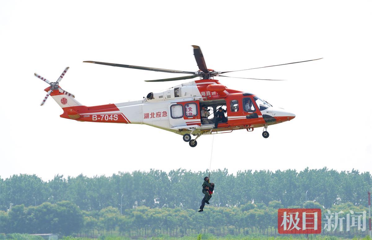 5月8日,来自海直通航的AW139-B704S直升机在汉南通用机场展示低空应急救援。极目新闻记者看到,担架和“受伤”人员已经送达指定地点,直升机进入机场跑道后,在10米高度悬停。地勤人员连接担架绳索,并通过对讲机联系直升机内工作人员,工作人员确认并收回绳索,担架缓慢上升进舱。随后,这架直升机转运“伤员”紧急送至医疗救护点。