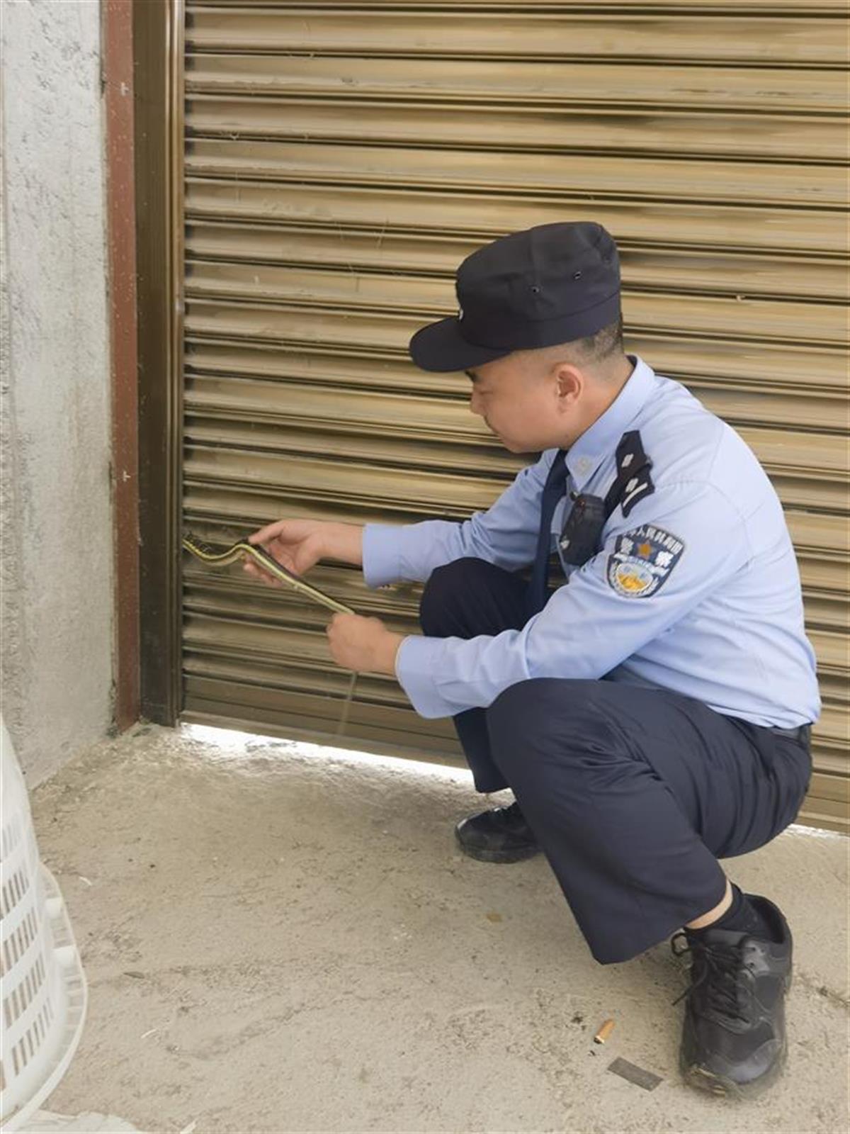 到达后,民警发现这条菜花蛇正试图往卷帘门的缝隙里钻,被困在了狭窄的门槽中。为了安全救出菜花蛇,民警与村民一起小心翼翼地操作卷帘门,缓缓将门卷起。在警民共同努力下,菜花蛇终于被解救出来。