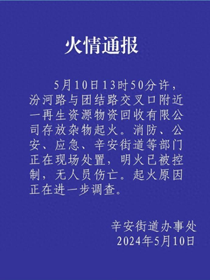 5月10日13时50分许,汾河路与团结路交叉口附近一再生资源物资回收有限公司存放杂物起火。消防、公安、应急、辛安街道等部门正在现场处置,明火已被控制,无人员伤亡。起火原因正在进一步调查。